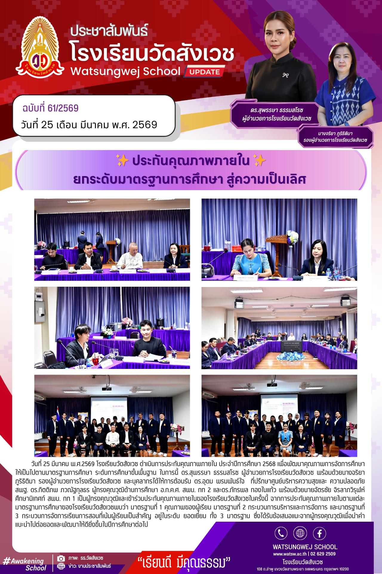 วันที่ 25 มีนาคม พ.ศ.2569 โรงเรียนวัดสังเวช ดำเนินการประกันคุณภาพภายใน ประจำปีการศึกษา 2568 เพื่อพัฒนาคุณภาพการจัดการศึกษาให้เป็นไปตามมาตรฐานการศึกษา ระดับการศึกษาขั้นพื้นฐาน ในการนี้ ดร.สุพรรษา ธรรมสโรช ผู้อำนวยการโรงเรียนวัดสังเวช พร้อมด้วยนางจริยา ภูริธิติมา รองผู้อำนวยการโรงเรียนวัดสังเวช และบุคลากรได้ให้การต้อนรับ ดร.อุดม พรมพันธ์ใจ ที่ปรึกษาศูนย์บริหารความสุขและ ความปลอดภัย สพฐ. ดร.กิตติภพ ภวณัฐกุลธร ผู้ทรงคุณวุฒิด้านการศึกษา อ.ก.ค.ศ. สพม. กท 2 และดร.ภัทรพล ทองในแก้ว พร้อมด้วยนายฉัตรชัย จิรลาภวิรุฬห์ ศึกษานิเทศก์ สพม. กท 1 เป็นผู้ทรงคุณวุฒิและเข้าร่วมประกันคุณภาพภายในของโรงเรียนวัดสังเวชในครั้งนี้ จากการประกันคุณภาพภายในตามแต่ละมาตรฐานการศึกษาของโรงเรียนวัดสังเวชพบว่า มาตรฐานที่ 1 คุณภาพของผู้เรียน มาตรฐานที่ 2 กระบวนการบริหารและการจัดการ และมาตรฐานที่ 3 กระบวนการจัดการเรียนการสอนที่เน้นผู้เรียนเป็นสำคัญ อยู่ในระดับ ยอดเยี่ยม ทั้ง 3 มาตรฐาน ซึ่งได้รับข้อเสนอแนะจากผู้ทรงคุณวุฒิเพื่อนำคำแนะนำไปต่อยอดและพัฒนาให้ดียิ่งขึ้นในปีการศึกษาต่อไป
