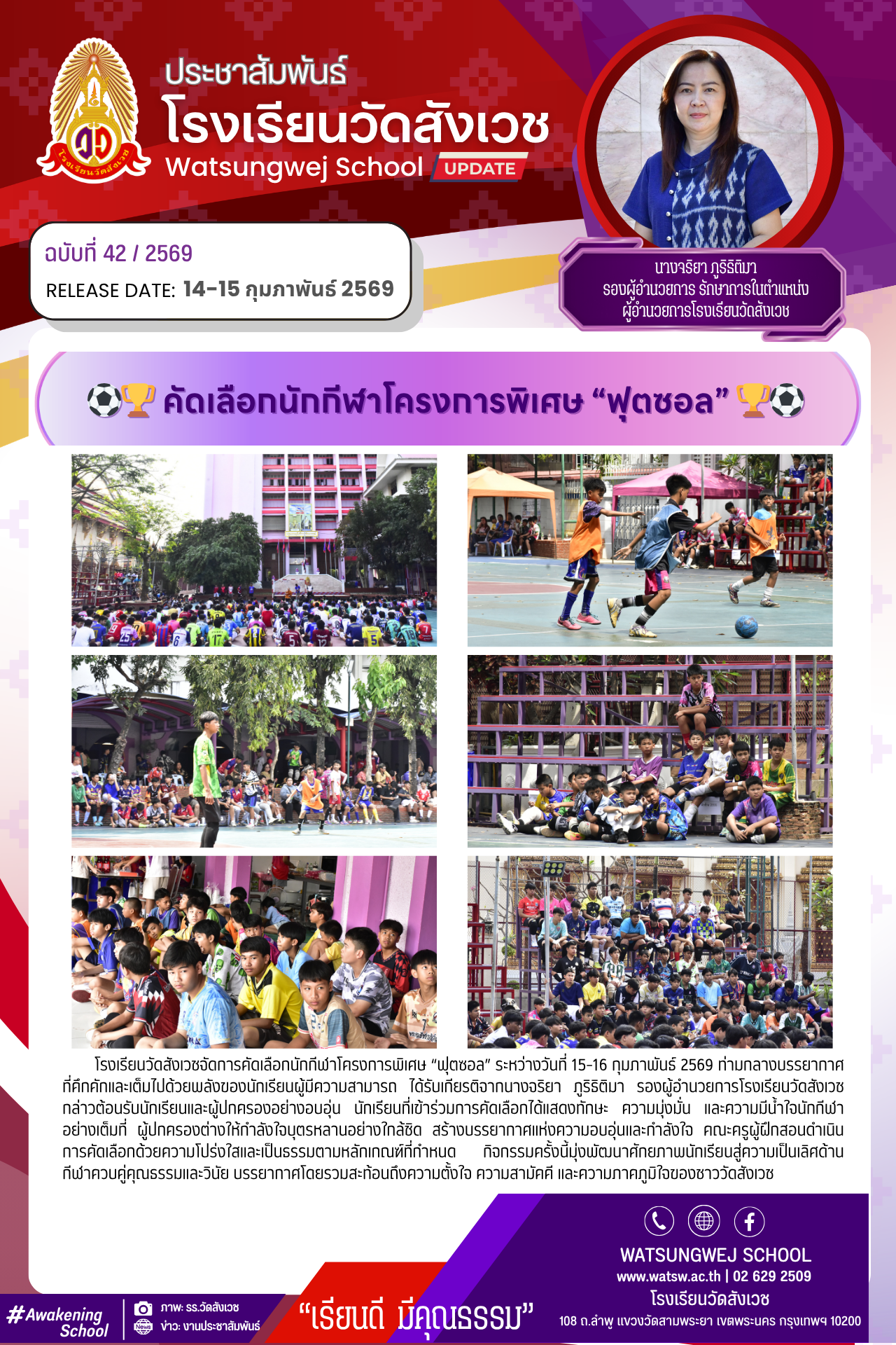 โรงเรียนวัดสังเวชจัดการคัดเลือกนักกีฬาโครงการพิเศษ “ฟุตซอล” ระหว่างวันที่ 15–16 กุมภาพันธ์ 2569 ท่ามกลางบรรยากาศที่คึกคักและเต็มไปด้วยพลังของนักเรียนผู้มีความสามารถ ได้รับเกียรติจากนางจริยา ภูริธิติมา รองผู้อำนวยการโรงเรียนวัดสังเวช กล่าวต้อนรับนักเรียนและผู้ปกครองอย่างอบอุ่น นักเรียนที่เข้าร่วมการคัดเลือกได้แสดงทักษะ ความมุ่งมั่น และความมีน้ำใจนักกีฬาอย่างเต็มที่ ผู้ปกครองต่างให้กำลังใจบุตรหลานอย่างใกล้ชิด สร้างบรรยากาศแห่งความอบอุ่นและกำลังใจ คณะครูผู้ฝึกสอนดำเนินการคัดเลือกด้วยความโปร่งใสและเป็นธรรมตามหลักเกณฑ์ที่กำหนด กิจกรรมครั้งนี้มุ่งพัฒนาศักยภาพนักเรียนสู่ความเป็นเลิศด้านกีฬาควบคู่คุณธรรมและวินัย บรรยากาศโดยรวมสะท้อนถึงความตั้งใจ ความสามัคคี และความภาคภูมิใจของชาววัดสังเวช