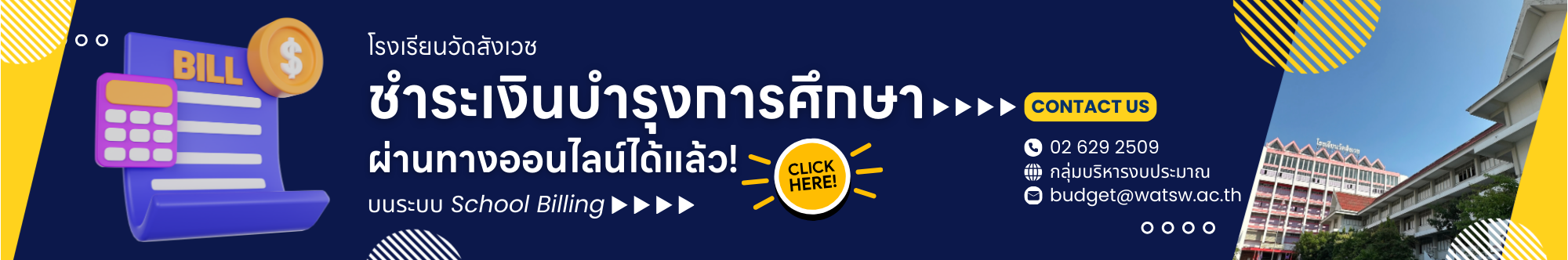 โทร. 02 629 2509 โทรสาร 02 282 4444, วิชาการ โทร. 02 281 1756, งานบุคคล โทร. 02 126 6932 e-mail: ww@watsw.ac.th